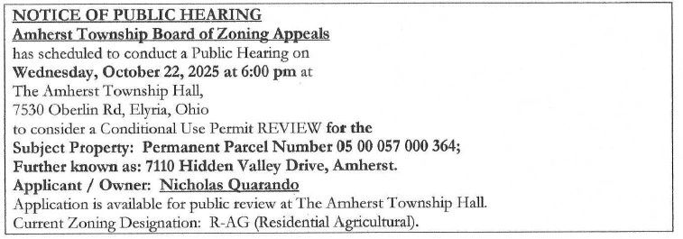 Amherst Township Complex located at 7530 Oberlin Road (WEST side of Oberlin Rd).